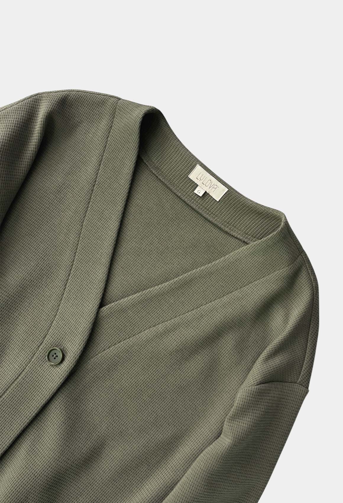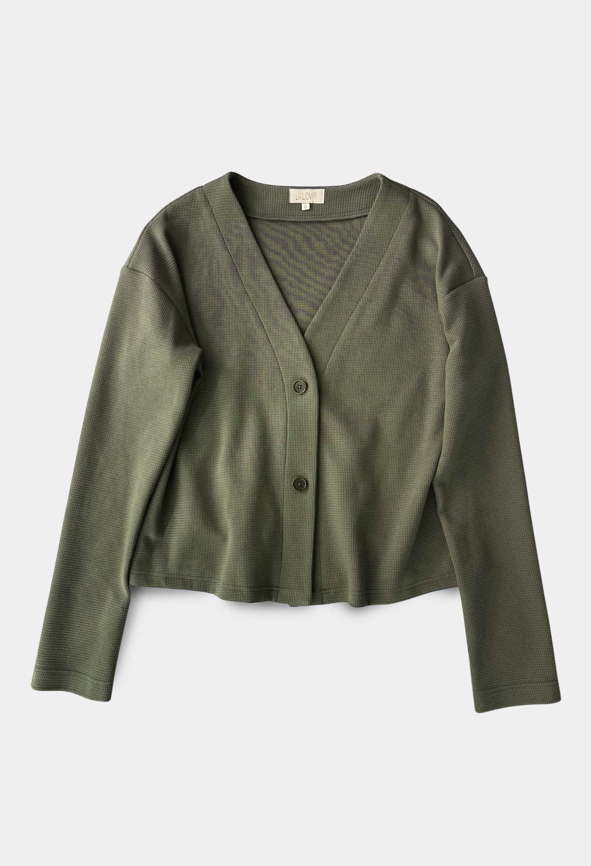 Der Cardigan ist weit und bequem geschnitten und hat lange Ärmel. Vorne wird der Cardigan mit zwei Knöpfen geschlossen.